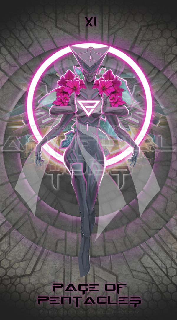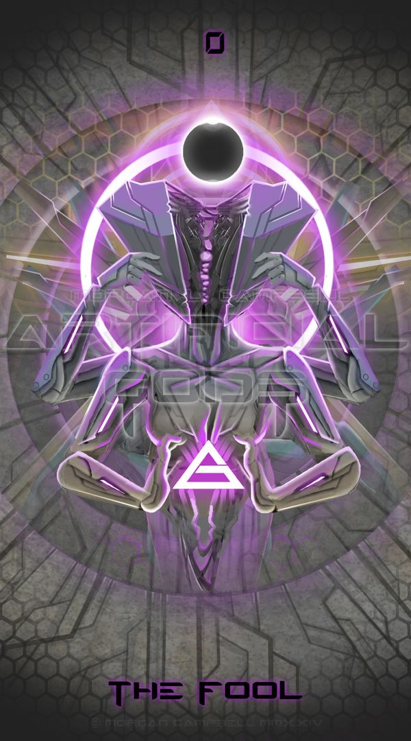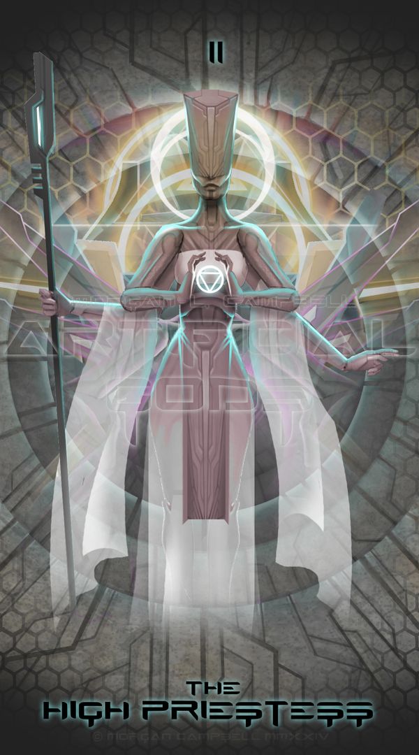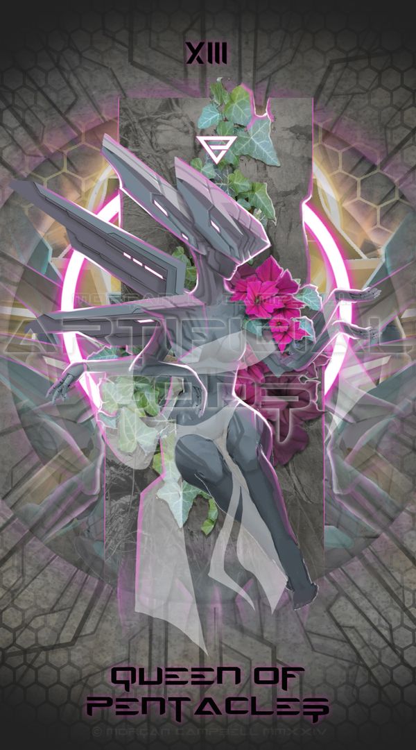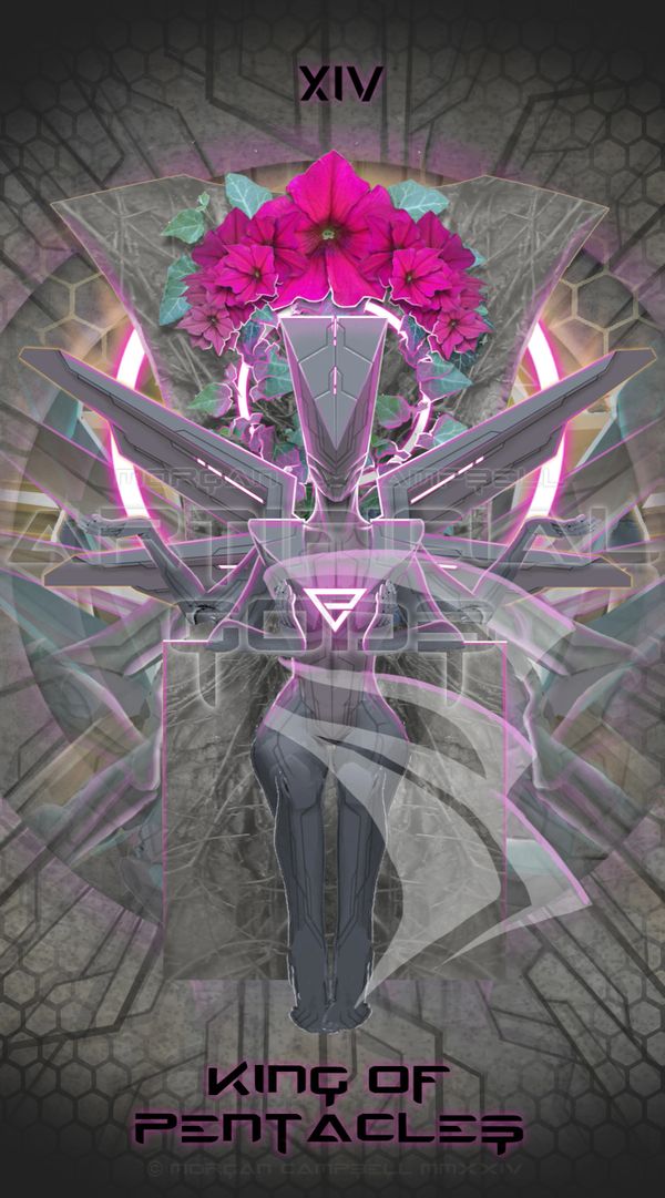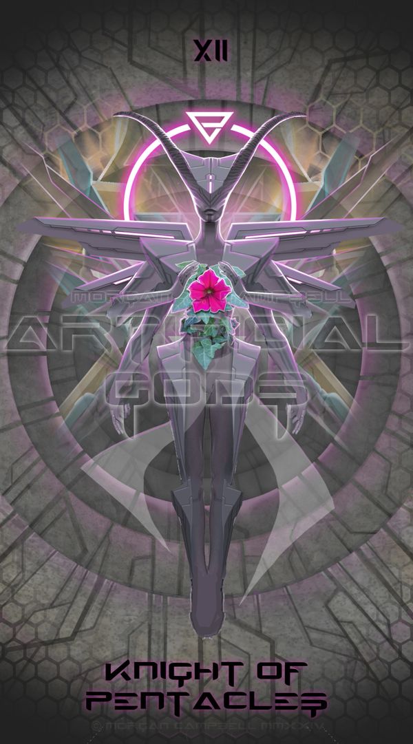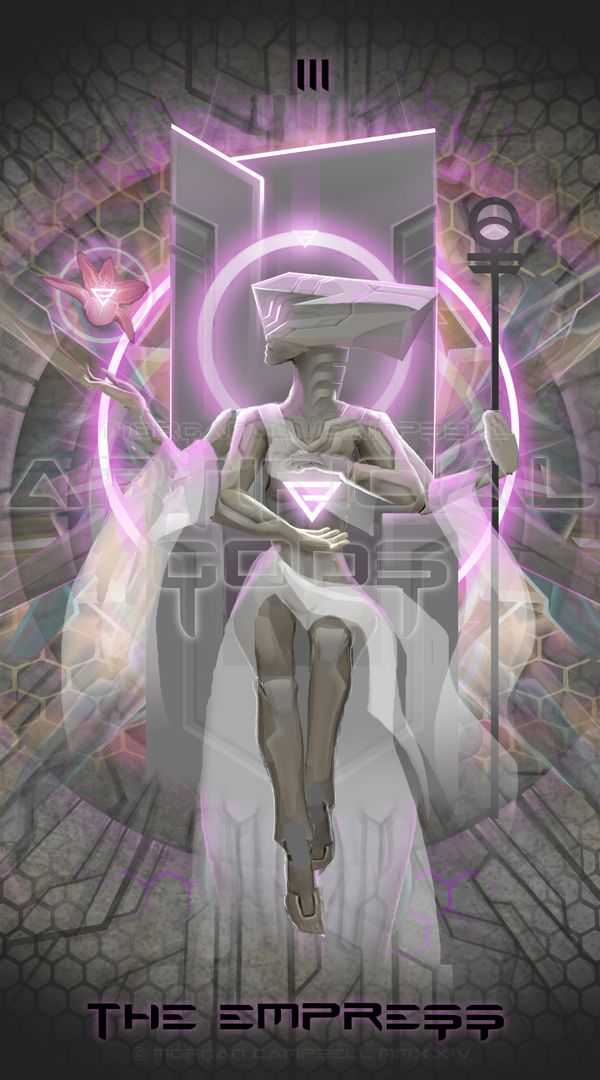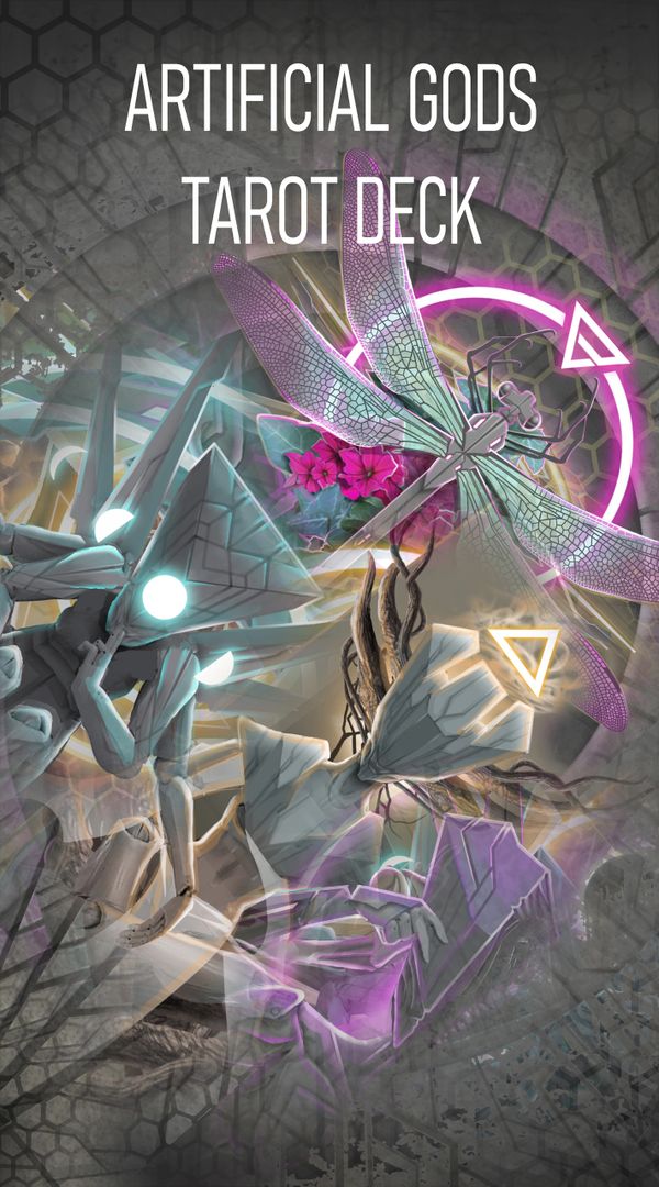 Delve into a digital fever dream of robotic Goddesses and neon halos, illuminating the juxtaposition of nature and technology. This surreal sci-fi tarot deck celebrates the marriage of these contrasting elements, exploring humanity's deification of artificial life, and offers a glimpse into the divine.