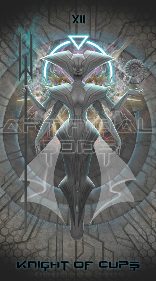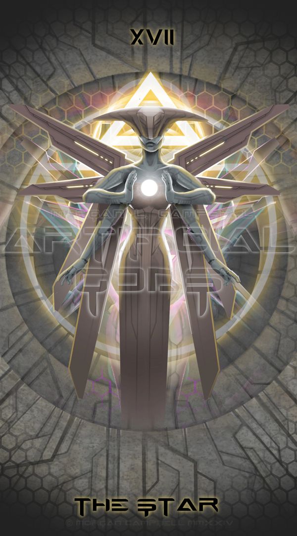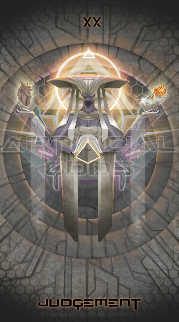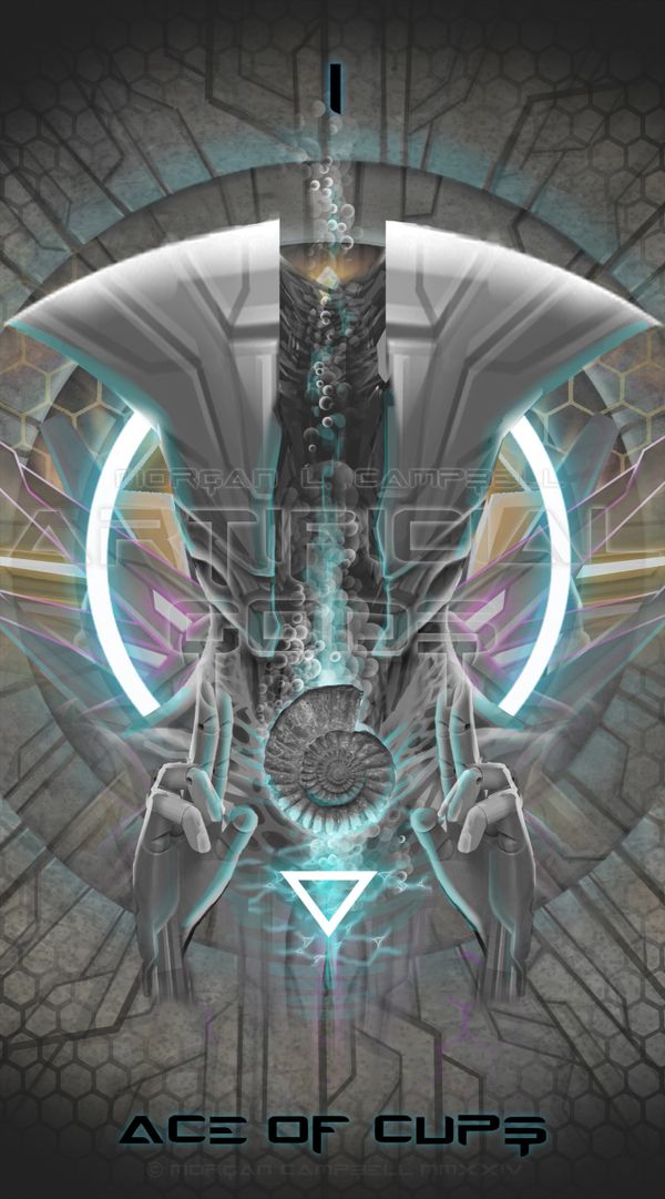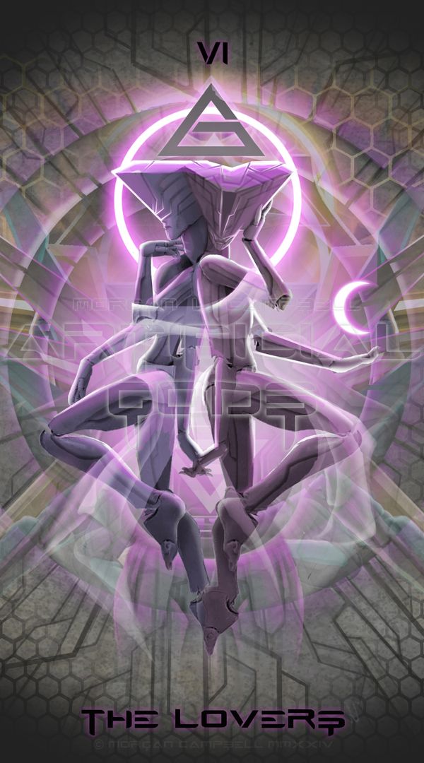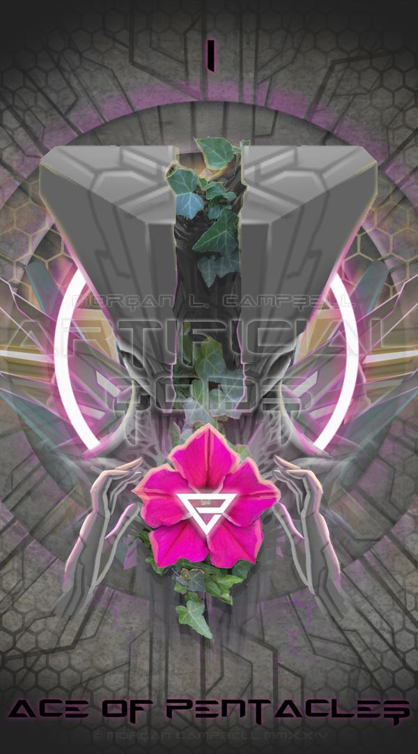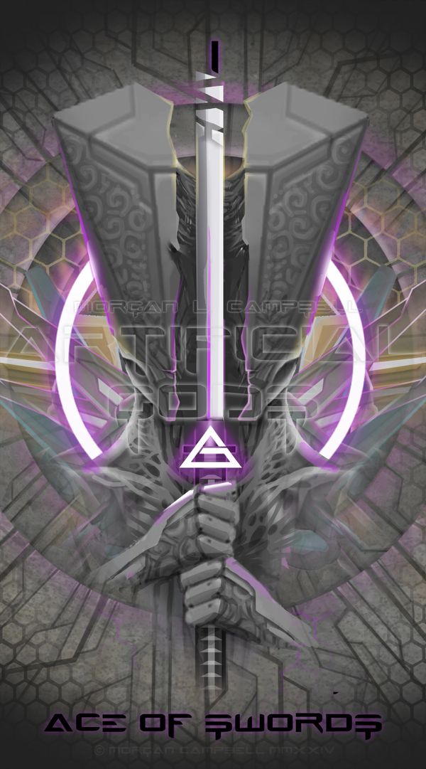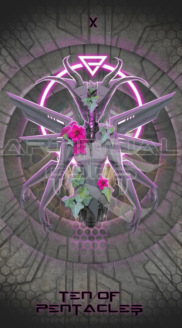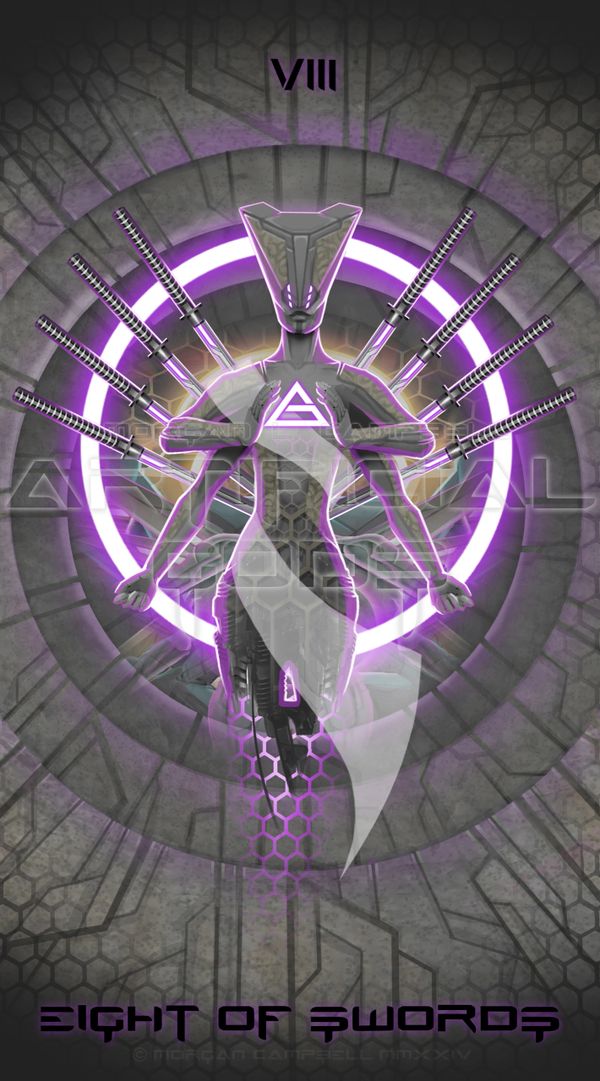 Delve into a digital fever dream of robotic Goddesses and neon halos, illuminating the juxtaposition of nature and technology. This surreal sci-fi tarot deck celebrates the marriage of these contrasting elements, exploring humanity's deification of artificial life, and offers a glimpse into the divine.